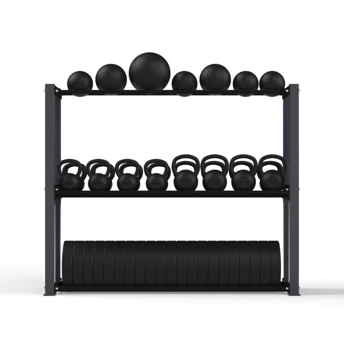 Masywna konstrukcja na bazie profili 80x80x2. Idealnie nadaje się do przechowywania obciążenia i akcesoriów treningowych.Półka przeznaczone na kettle wyłożona jest matą gumową amortyzującą odkładanie ciężaru. Takie rozwiązanie świetnie sprawdzi się w klubach o dużym natężeniu ruchu.