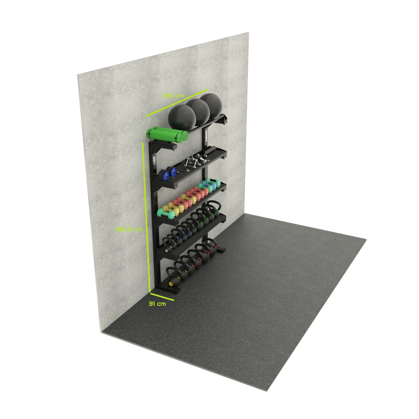 Konstrukcja regału opiera się na solidnej stalowej ramie, która zapewnia wysoką sztywność i stabilność nawet przy dużym obciążeniu. Zastosowanie półek o odpowiedniej głębokości umożliwia przechowywanie różnorodnego sprzętu, od hantli, przez kettlebelle, po akcesoria treningowe jak maty, gumy czy uchwyty. Przemyślany układ poziomów pozwala na logiczne rozmieszczenie sprzętu, co przekłada się na lepszą organizację i szybszy dostęp podczas treningu.Półki wykonane są z wytrzymałej blachy, która dobrze znosi intensywne użytkowanie i kontakt z ciężkim sprzętem. Dodatkowo odpowiednie krawędzie zabezpieczają sprzęt przed przypadkowym zsunięciem. Dodatkowo, półki regału zostały dodatkowo wyścielone trwałą matą gumową, która skutecznie chroni zarówno przechowywany sprzęt, jak i samą konstrukcję przed zarysowaniami oraz uszkodzeniami. To rozwiązanie zwiększa przyczepność, ogranicza hałas podczas odkładania akcesoriów i podnosi komfort codziennego użytkowania, szczególnie w intensywnie eksploatowanych przestrzeniach treningowych.